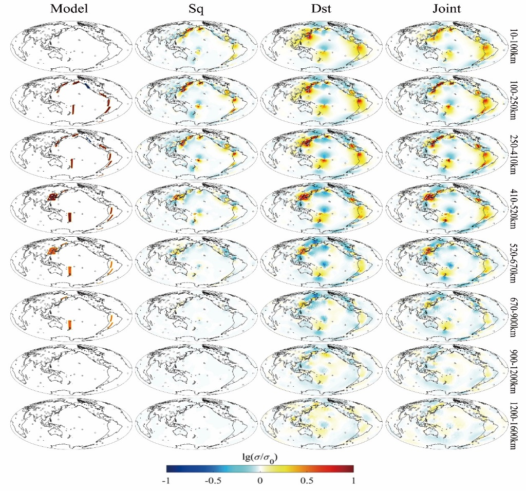 完成电离层信号和磁层信号的多源联合反演,并反演电离层全球到局部的转换函数和磁层的C响应函数。通过采用球坐标系下四面体单元网格进行单元离散,因此,拟采用一种四面体最长边二等分(tetrahedral longest edge bisection,TLEB)的方法,在反演过程中解耦正反演网格。通过频率和区域双重并行策略,提高大规模区域计算的效率。采用slab模型进行测试,联合和单一反演结果如图3所示,联合多源电磁数据的反演在较传统磁层信号反演的基础上融入了电离层信号的反演,能更好约束上地幔的电性结构。为大地电磁的多源电磁联合反演奠定技术基础。